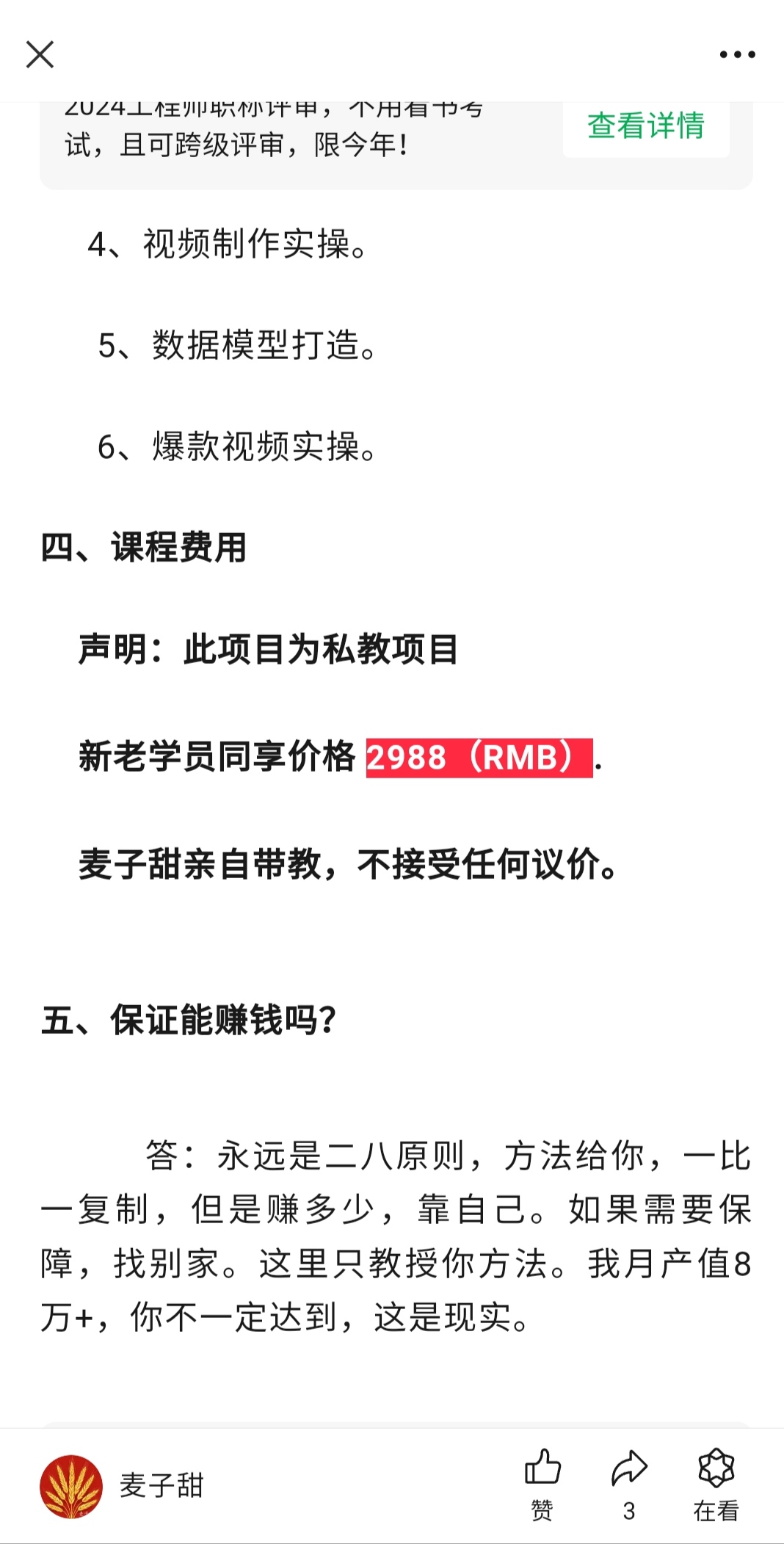 项目介绍:老项目继续来,麦子甜经过3个月的精心测试,在原有带货基础上进行了拓展。更新了玩法,抗造能力更强,盈利更持久。实现了视频一鱼多吃,多重管道收益的方式,通过10节课程,从文案到选品,收益到矩阵的放大做了详细推演并拥有自己的一套打法。适合个人,工作室公司形式操作,多样化的变现途径和收益管道适合多重赛道。
