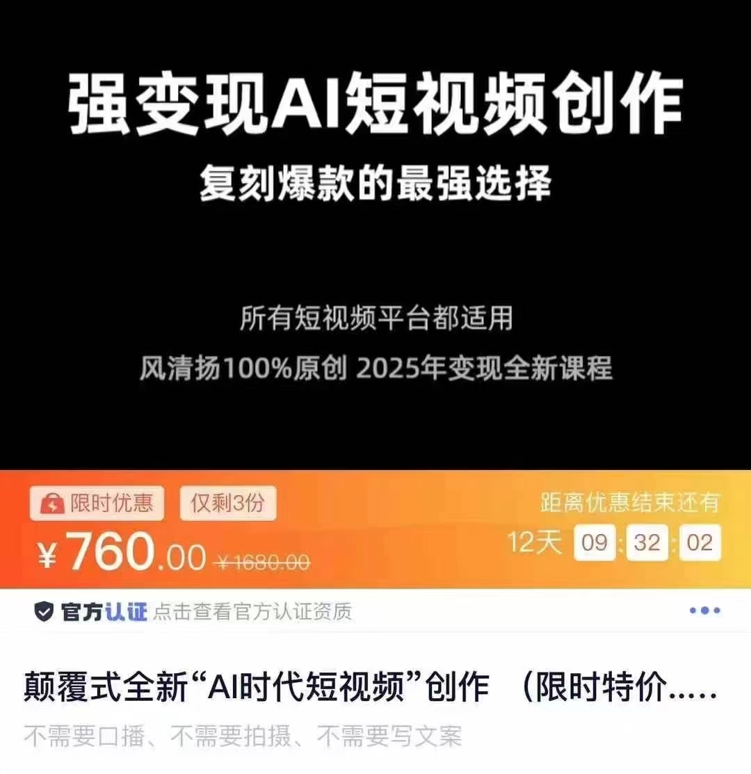 副业项目库 » 风清扬《AI时代变现短视频创作》学AI剪辑投放,提升视频高清处理,成为天才策划