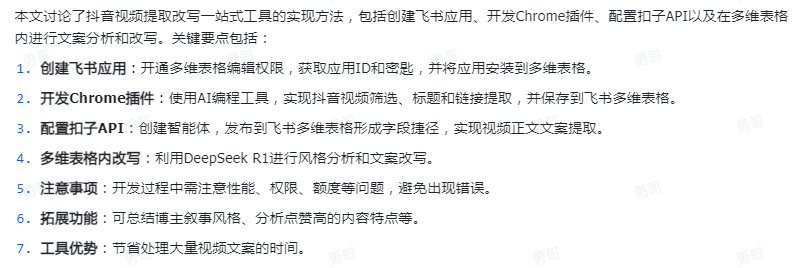 admin 社群精华 2025-04-22 用飞书多维表格一键批量提取、改写抖音爆款文案 VIP免费 永久VIP免费当前隐藏内容需要支付19.9积分已有7人支付 登录购买 副业项目库内容全部来自网络,版权争议与本站无关,如果您认为侵犯了您的合法权益,请联系我们删除,并向所有持版权者致最深歉意!本站所发布的一切学习教程、软件等资料仅限用于学习体验和研究目的;请自觉下载后24小时内删除,如果您喜欢该资料,请支持正版!副业项目库 » 用飞书多维表格一键批量提取、改写抖音爆款文案